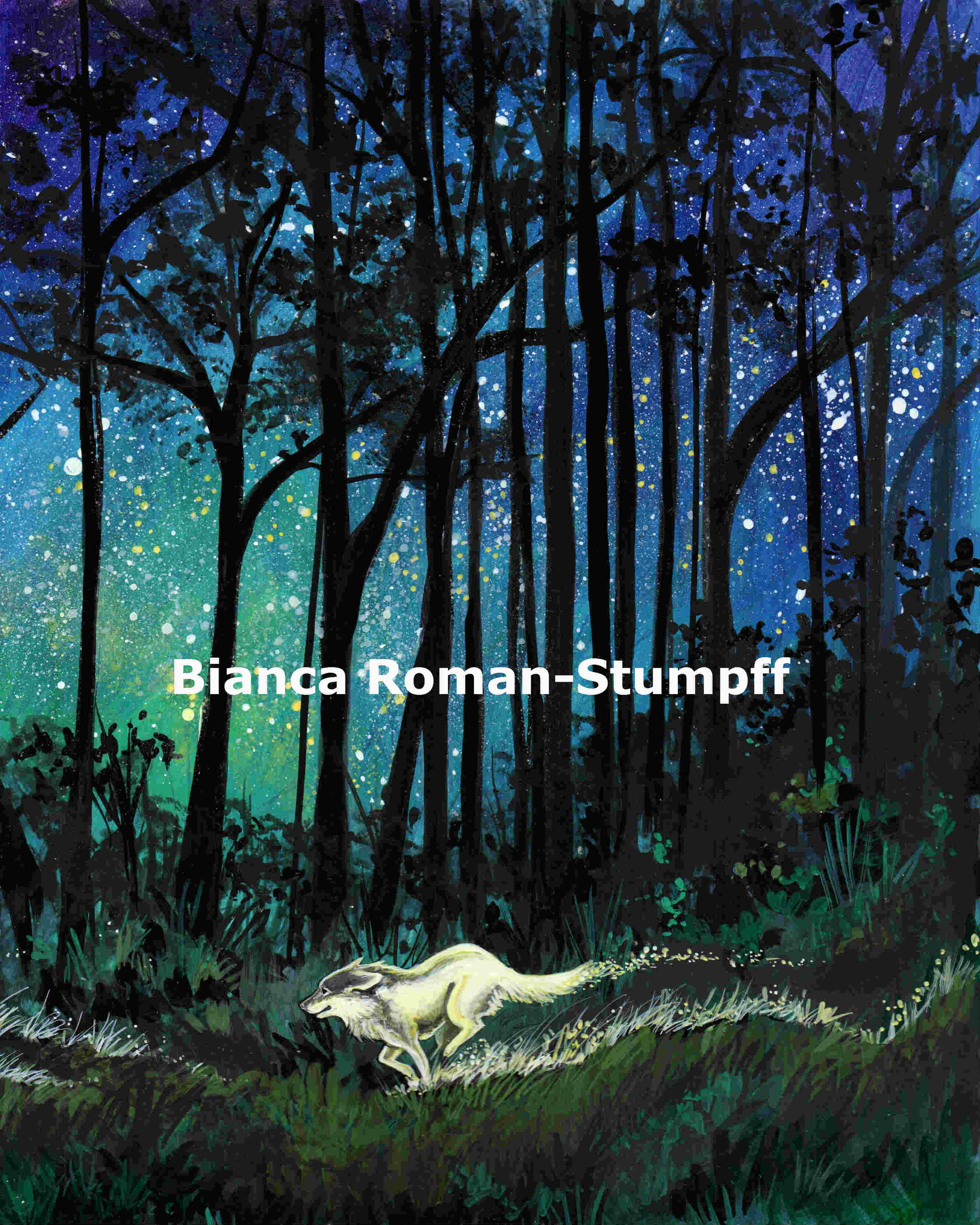 This is part of The Chase set. The wolf is running after two deer in the woods under a starlit sky.