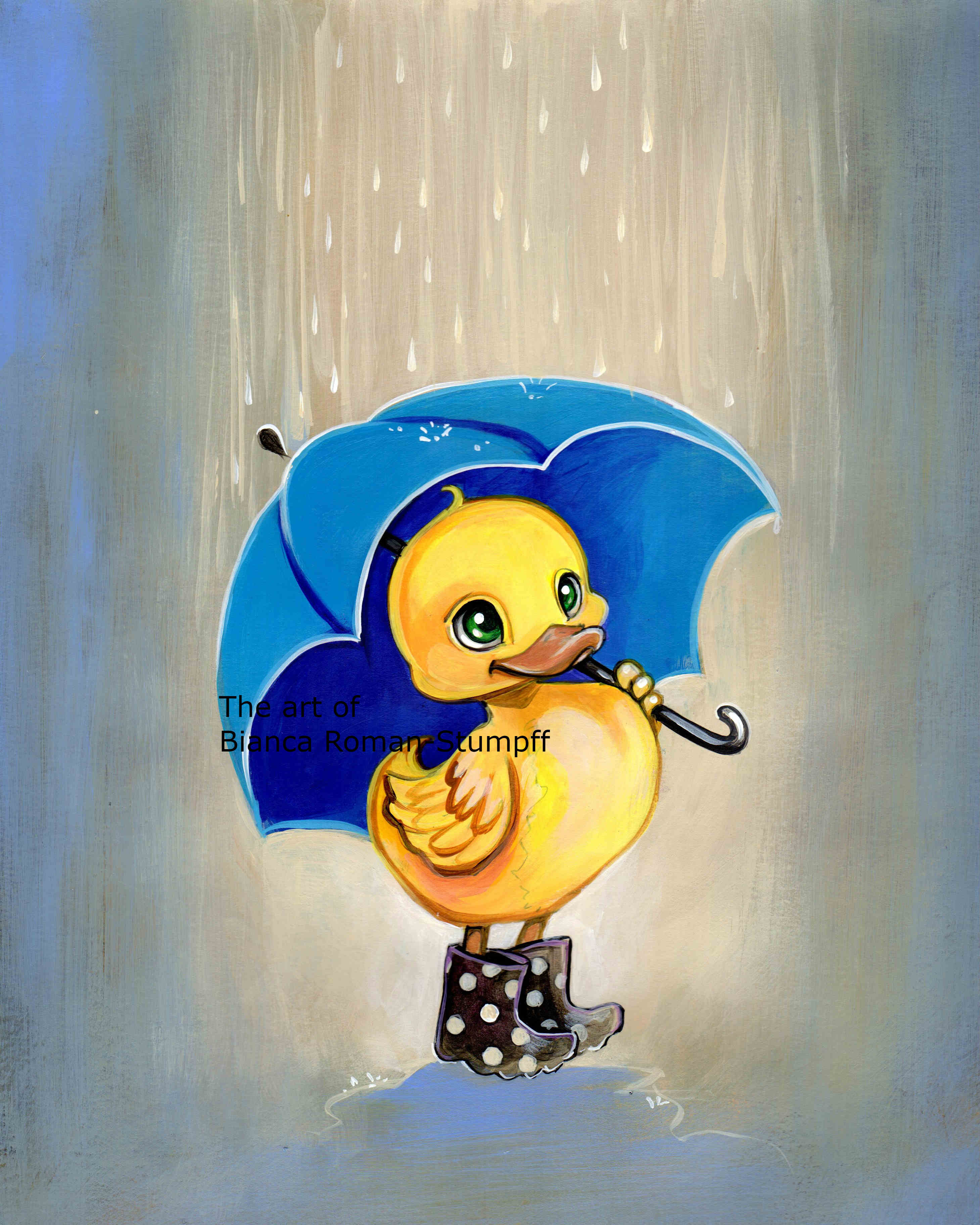 This little ducky is all ready for the rain with a blue umbrella and polka dot boots.