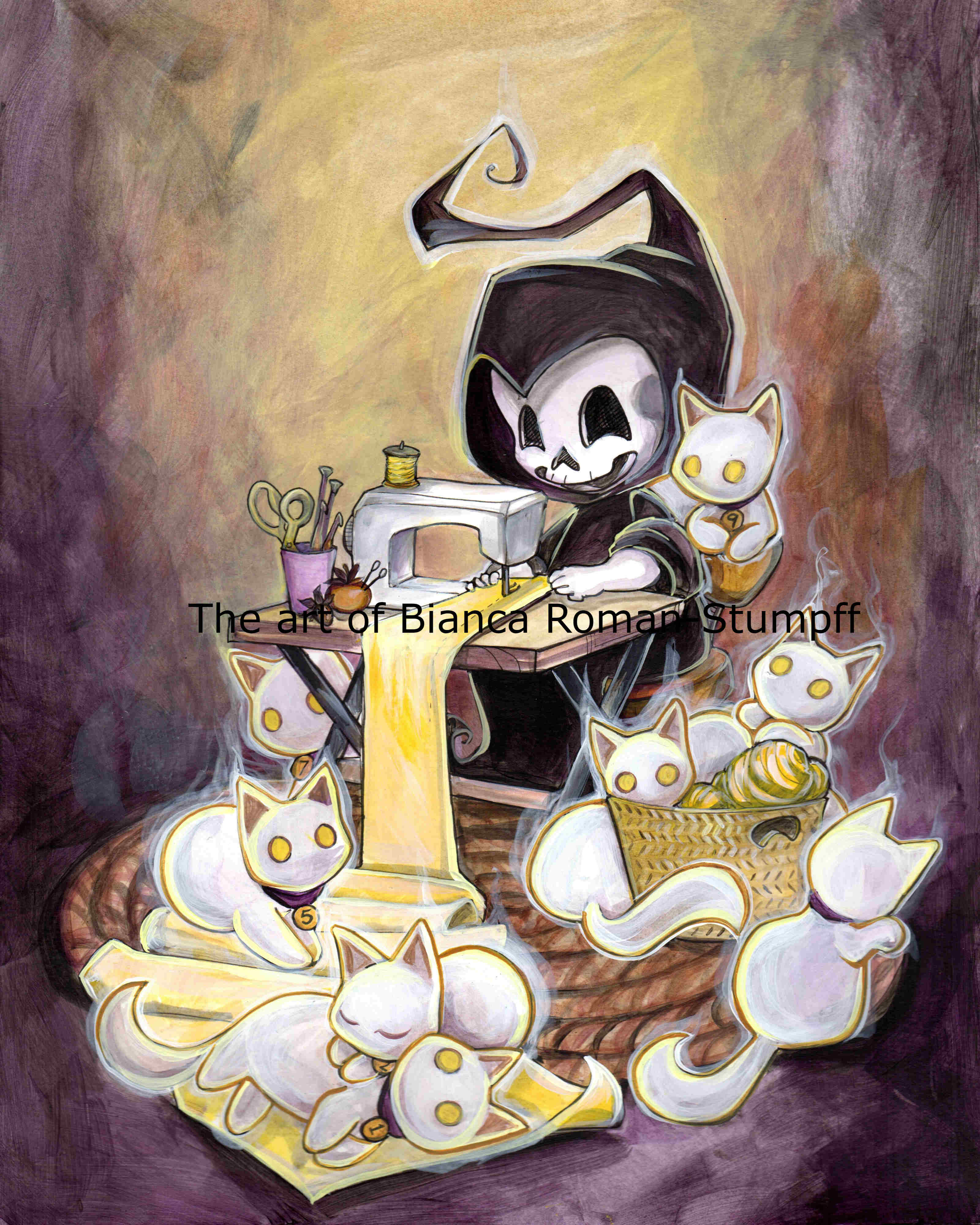 Death sits and sews with the thread of life while surrounded by all nine lives.
