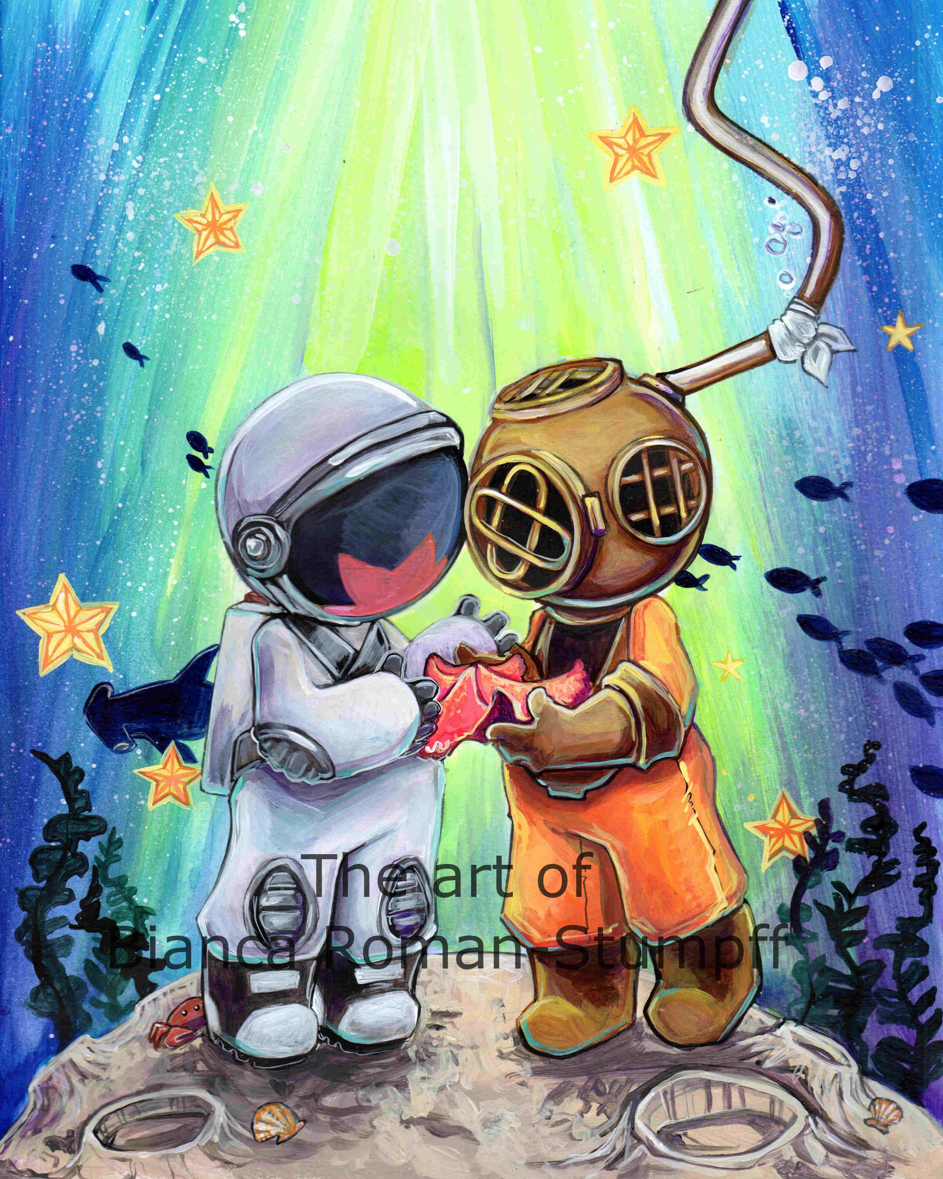 The astronaut and the diver are the farthest we have ever gone in our search. The astronaut has found the starfish and has given it to the diver.
