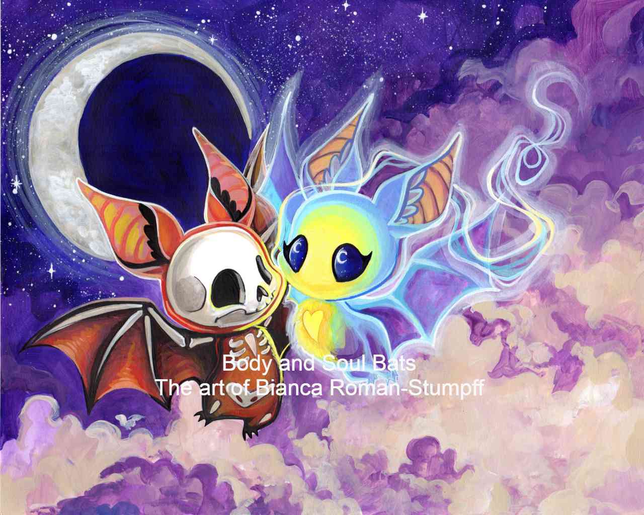 This painting of Body and Soul bats were inspired by Choly Knight's plushies based on my art of Body and Soul. Like an inspiration sandwich.